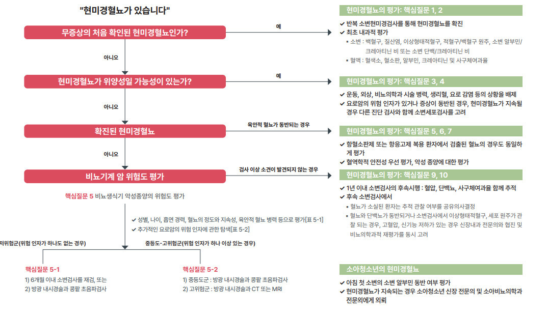 이 경우 핵심은 요로 악성종양, 결석, 구조적 병변, 감염을 놓치지 않는 것입니다.[1] 대한신장학회 지침은 중등도 위험군 이상에서 비뇨의학과 의뢰를 권고하고, 원인 파악을 위해 방광내시경과 상부요로 영상검사를 시행하도록 제시합니다.[1]